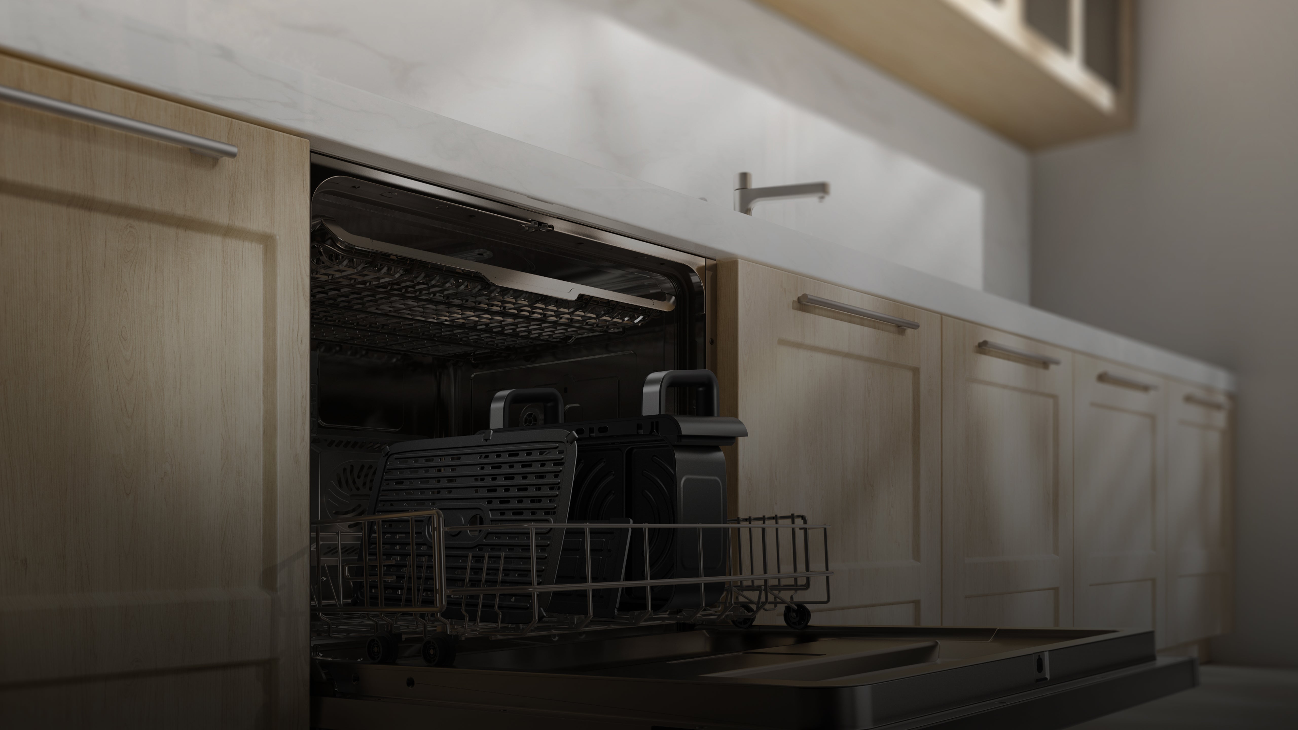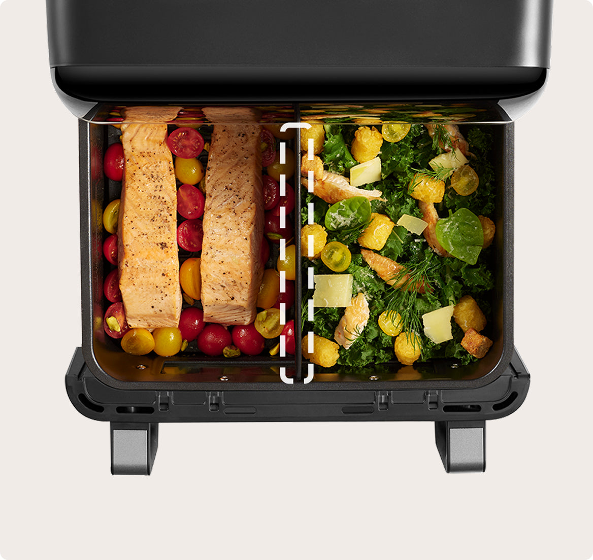 The FlexZone™ basket can be easily turned from a spacious 10L zone into two 5L separate chambers, providing flexibility for different dish sizes.