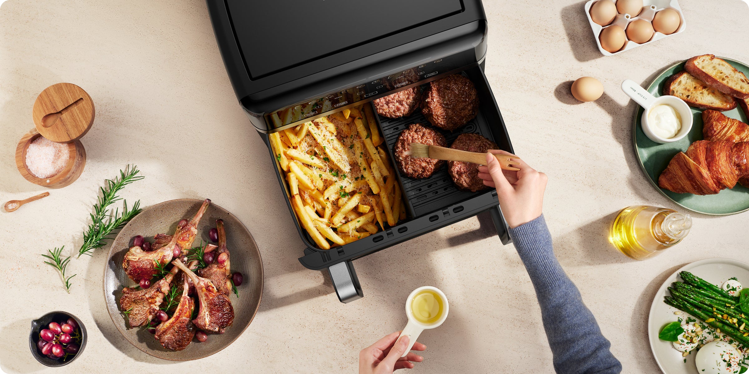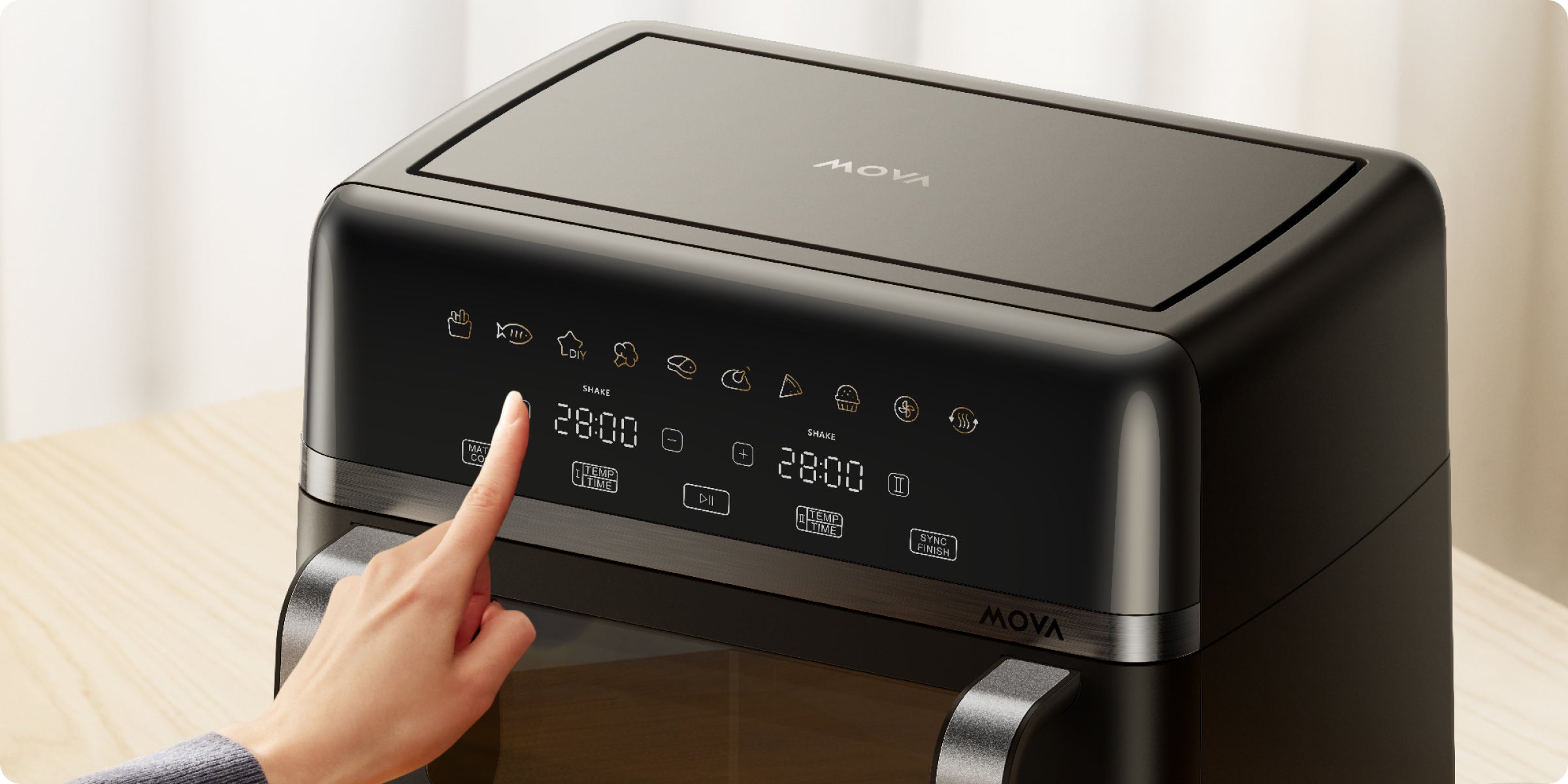 Simply tap to access 10 smart preset menus via the LED touch screen. Change between single feasts or dual-zone creativity in one touch. You can freely adjust time and temperature for your creative cooking.