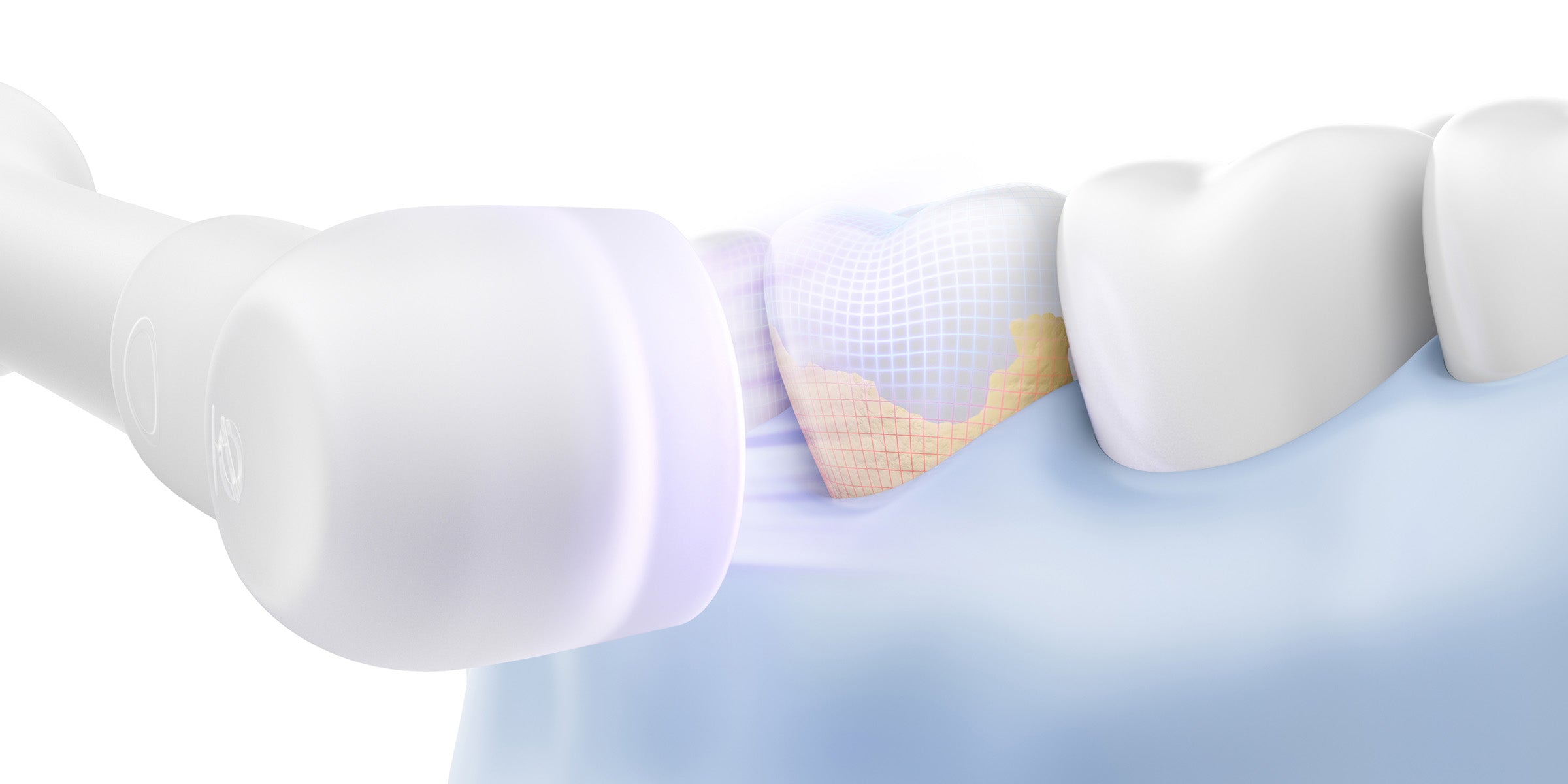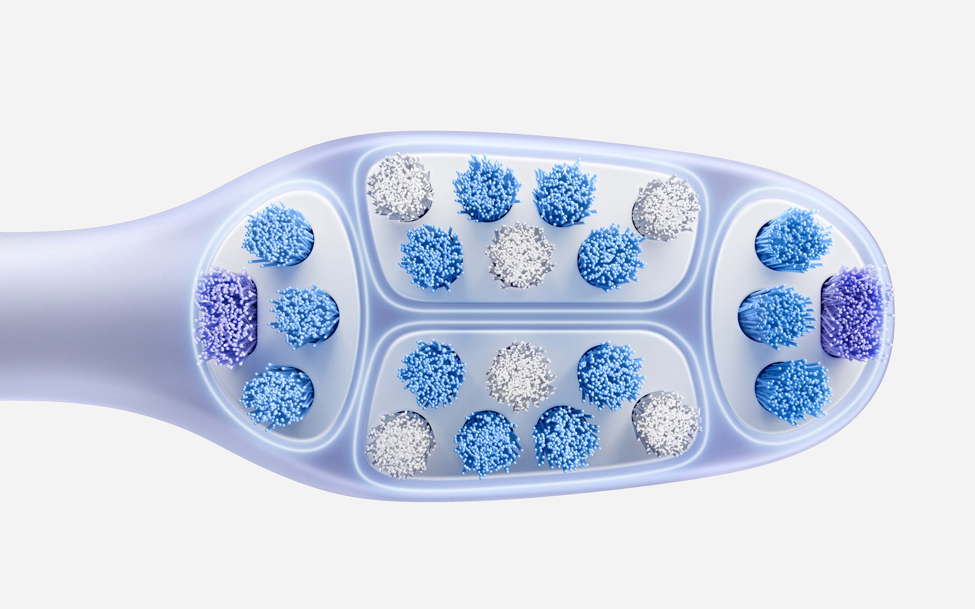 Brush head 4-Zone Design auto-adjust to tooth contours and gaps for larger area coverage. Soft silicone encapsulation and shock-absorbing air cushion minimizes gum irritation, even if bristles contact the most sensitive parts of the teeth and gums.