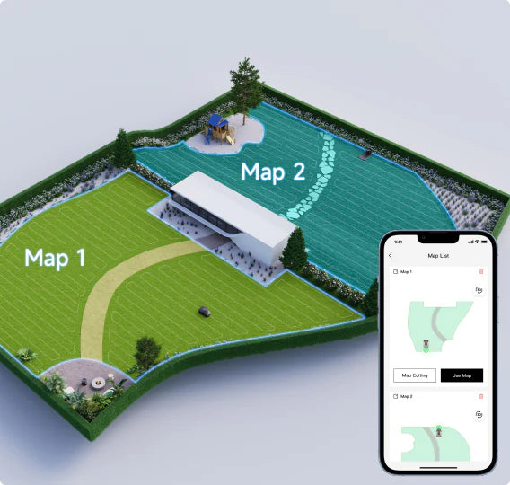 Use the Movahome App for dual-map and multi-zone management, easily defining areas and no-go zones to ensure smart, efficient, and customizable lawn care.