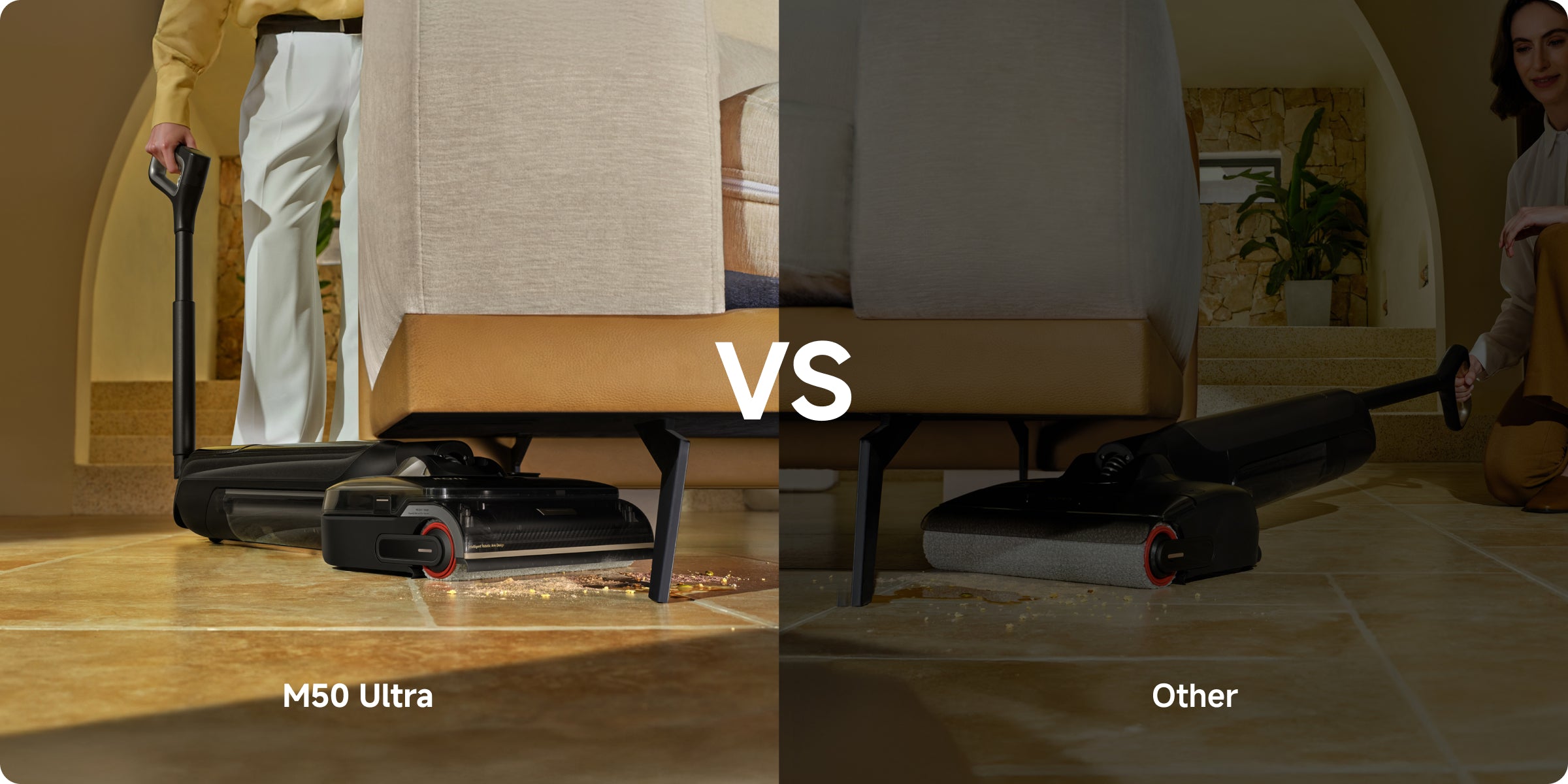 No more worries about narrow gaps! The M50 Ultra’s Lie-Flat Reach technology lets it slide under furniture as low as 13-14 cm, delivering outstanding cleaning performance even when lying flat on the floor.