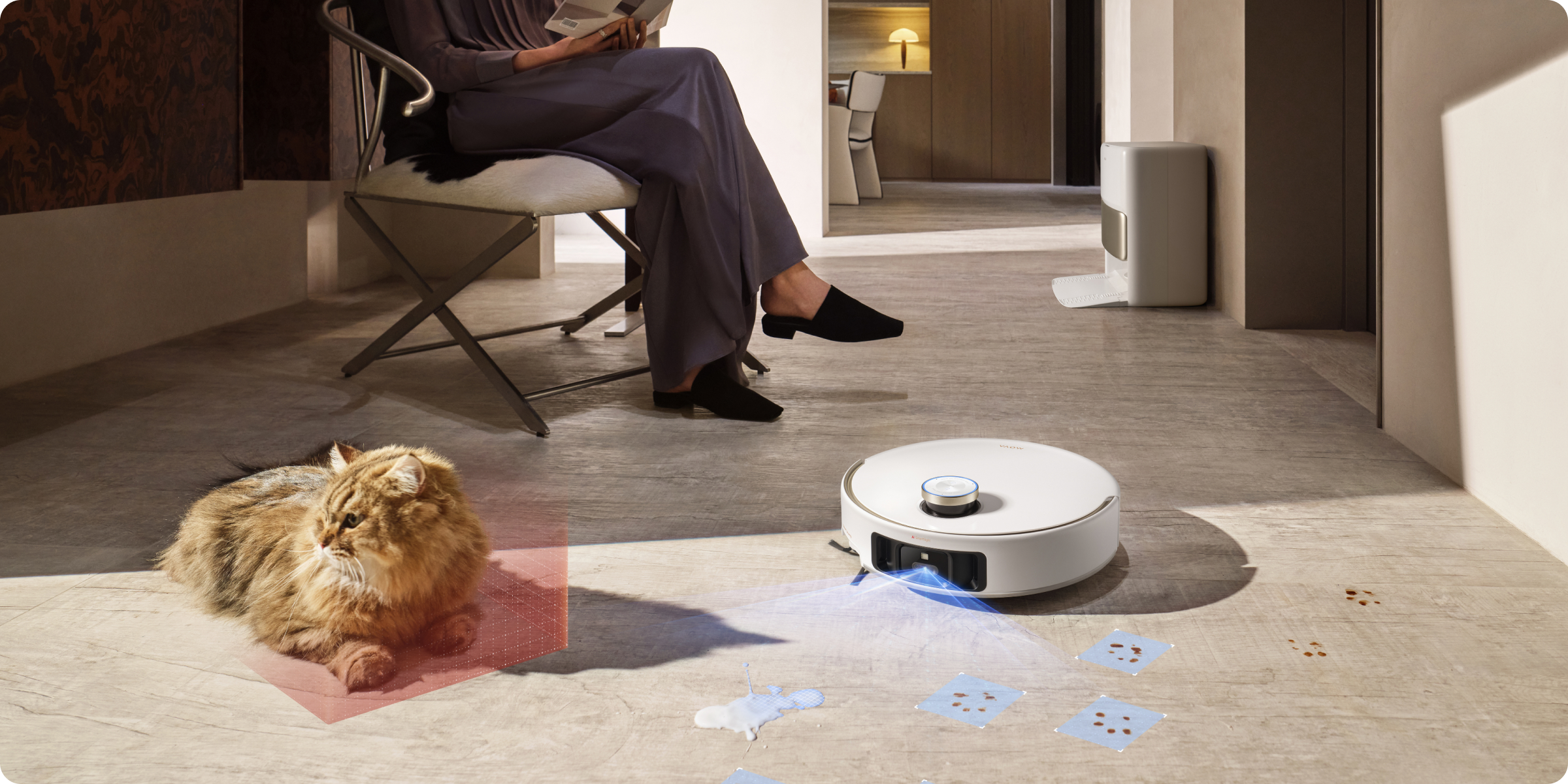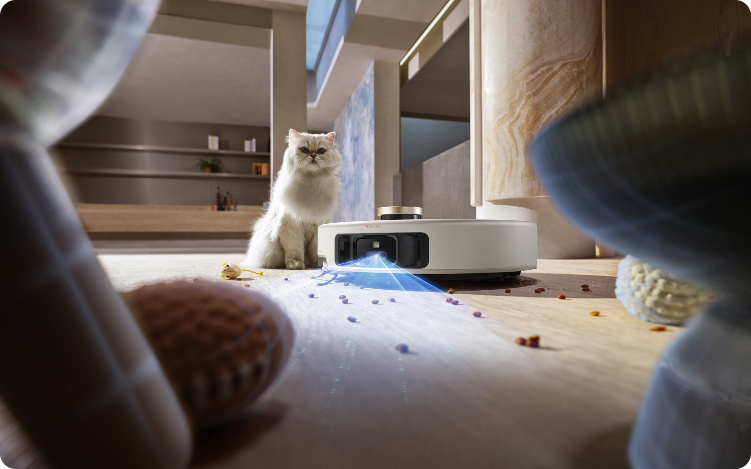 V50 Ultra uses RGB Camera and Intelligent Dirt Detection Technology to identify and differentiate between solid, liquid, and mixed stains. It effectively tackles heavy, sticky stains like oil or soy sauce on hard floors. The system detects the dirt level and, if a pet is present, adjusts its cleaning strategy accordingly for a more efficient and thorough clean.