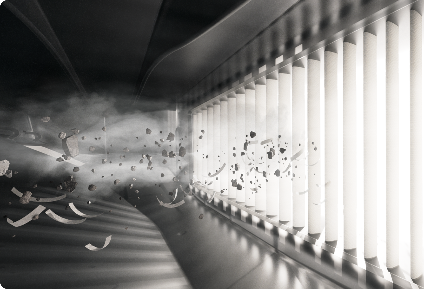 When the base station collects dust, exhaust air from the base station fan is blown back into the HEPA filter, dislodging dust and maintaining strong suction without clogging.