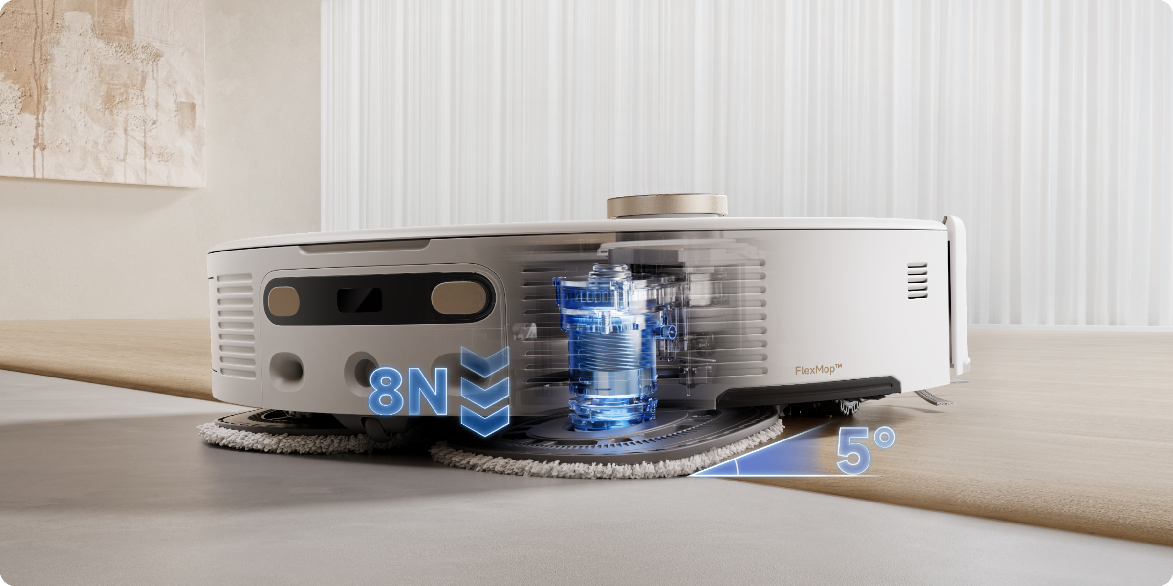 The floating mop pad holder can move up by 2mm and down by 1mm, while the round mop pad can adjust its angle by 5°, ensuring a tighter contact on uneven surfaces. Balanced pressure enhances floor coverage and mop self-wash efficiency, leaving the floor cleaner and mop drier.