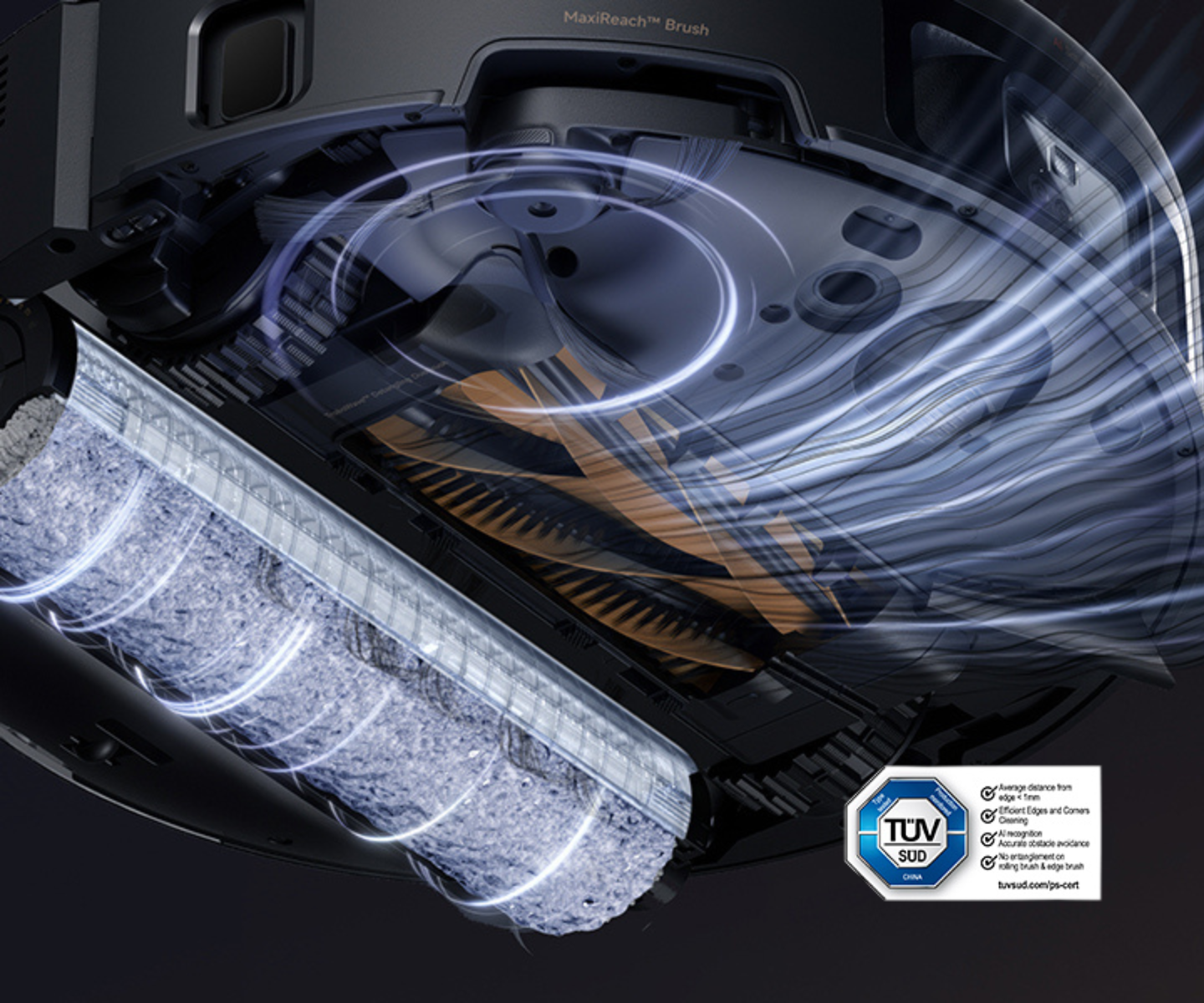 With MaxiReach™ Brush, side brush dynamicallyextends to sweep up dust, hair, and debris-achieving 99.99%* edge coverage.